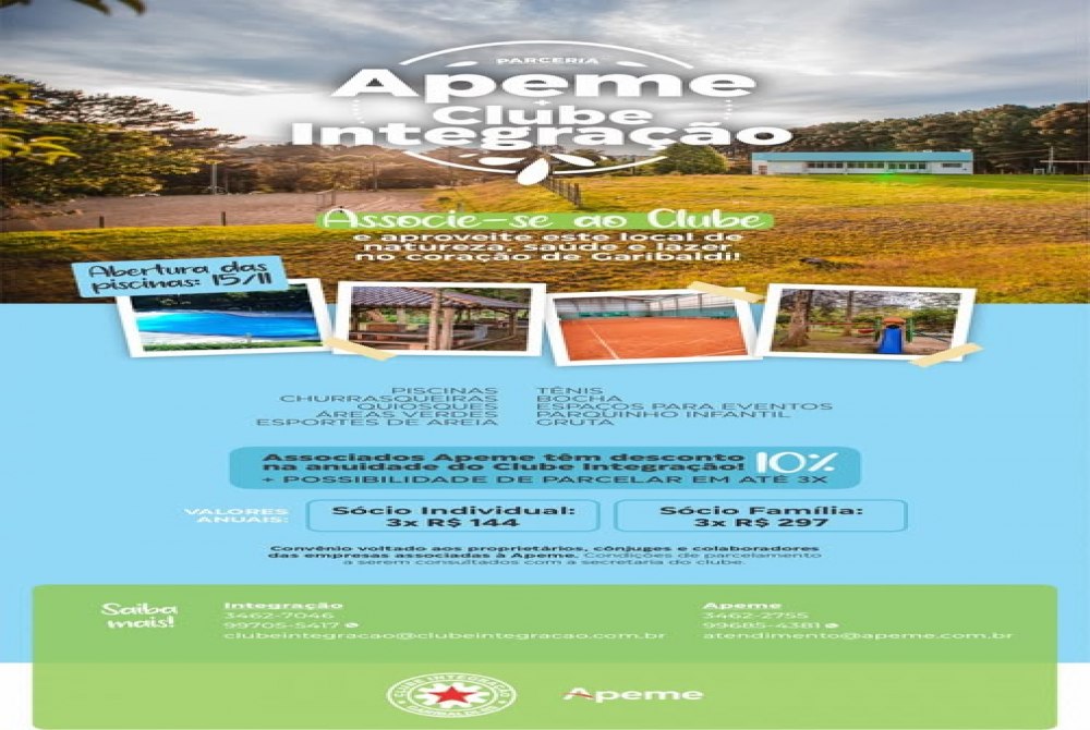 A Associação das Pequenas e Médias Empresas de Garibaldi (Apeme) renovou nesta semana o convênio com o Clube Integração. Para a temporada 2025/2026, proprietários, cônjuges e colaboradores das empresas associadas à Apeme têm desconto de 10% na anuidade para se tornarem sócios do Clube e podem parcelar o valor em até três vezes. São duas modalidades: Sócio Individual (3x R$ 147,00, com desconto já incluso) ou Sócio Família (3x R$ 297,00). A parceria é válida também para quem já for associado às duas entidades: nesse caso o desconto é aplicado na renovação do contrato. Se você ficou interessado nessa oportunidade, entre em contato com a Apeme, através do WhatsApp (54) 99685-4381 e informe-se.